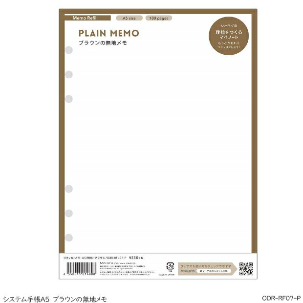 商品名 マークス システム手帳 A5正寸 リフィル 無地メモ システム手帳 リフィル デスクサイズ 6穴 品番 ODR-RFL07-P サイズ 横148×縦210mm(A5サイズ 6穴) 入り数 100P・50枚 仕様 PP袋入、紙製 ◎日本製 メーカー 株式会社マークス MARK'S Inc ※A5サイズ対応商品です。